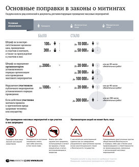 Штраф за воспрепятствование организации, проведению и участию в собрании, митинге, демонстрации, шествии или пикетировании, а также за принуждение к участию в них составит для граждан от 10 тысяч до 20 тысяч рублей, для должностных лиц - от 30 тысяч до 50 тысяч рублей. Сейчас эти штрафы составляют соответственно 100 рублей для граждан и от 100 до 300 рублей для должностных лиц.